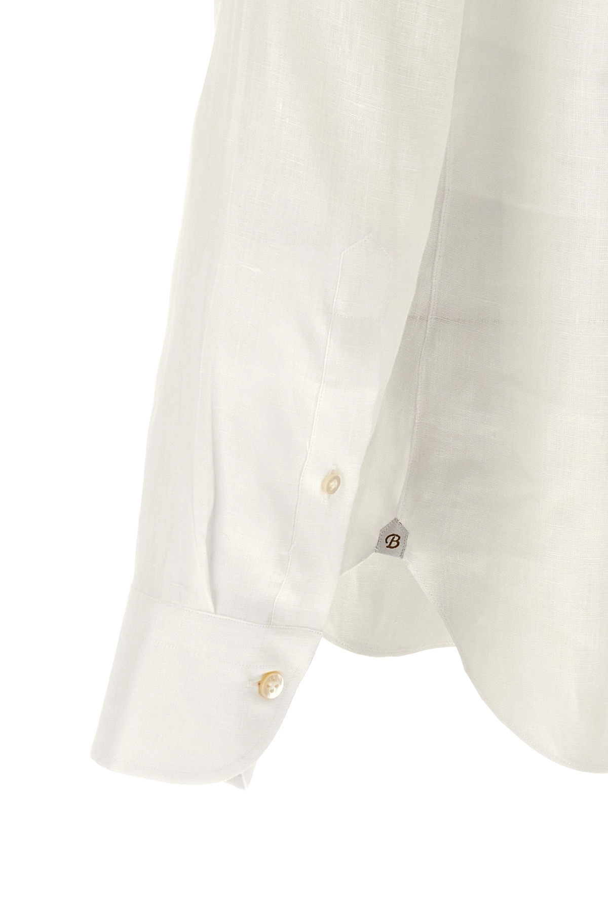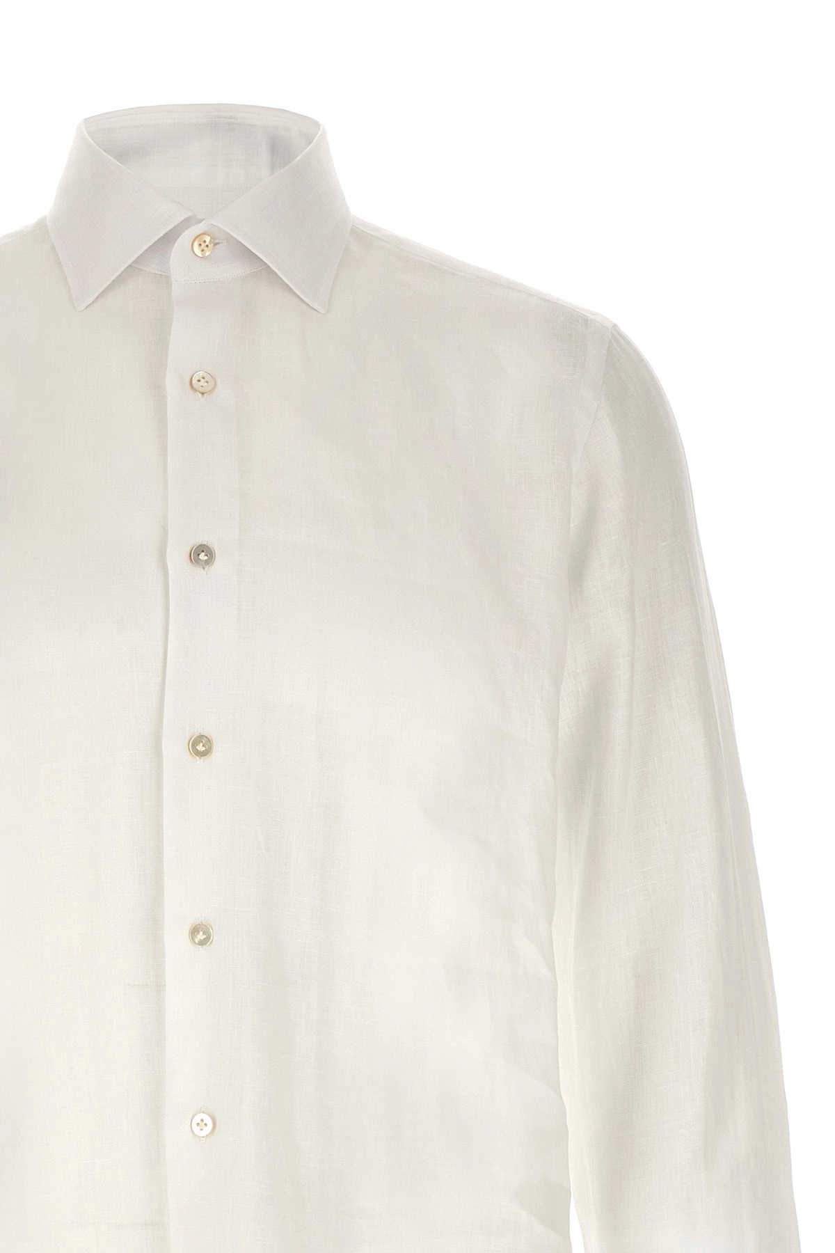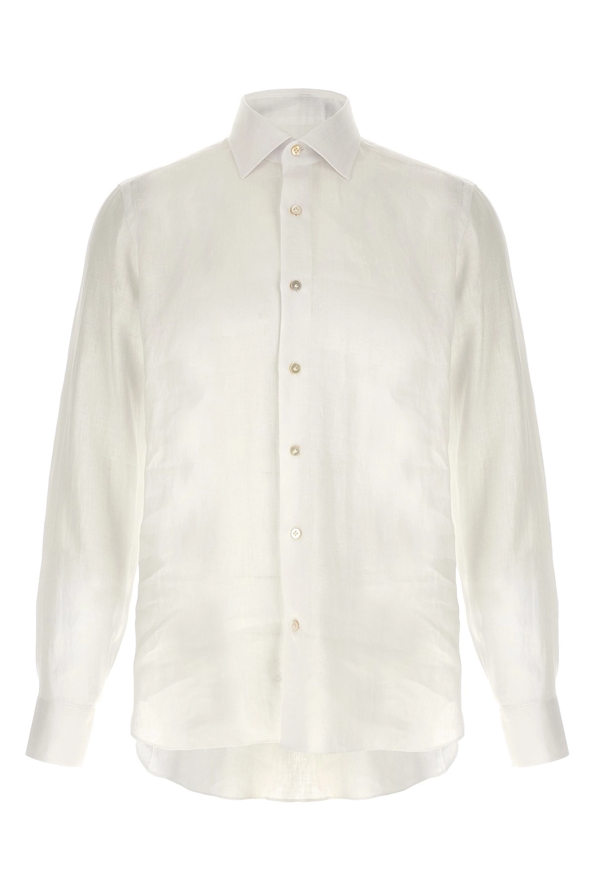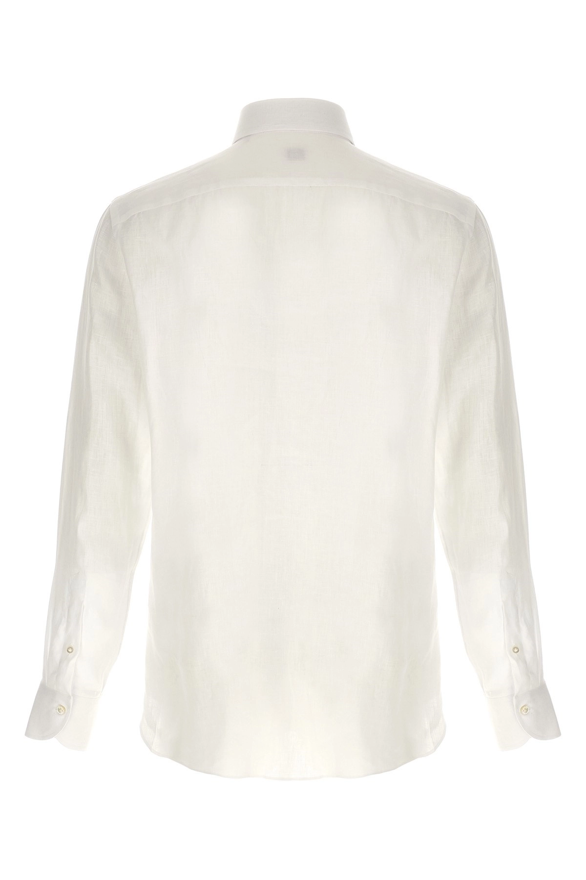 cod. 220191 Camicia in lino leggero cucita a mano, collo ‘Nigel’, chiusura bottoni in madreperla frontale, manica lunga con polsino, fondo capo stondato. Colore: Bianco Size & Fit: fit true to size — COLLAR size Tessuto: 100% linen Made in: Italia