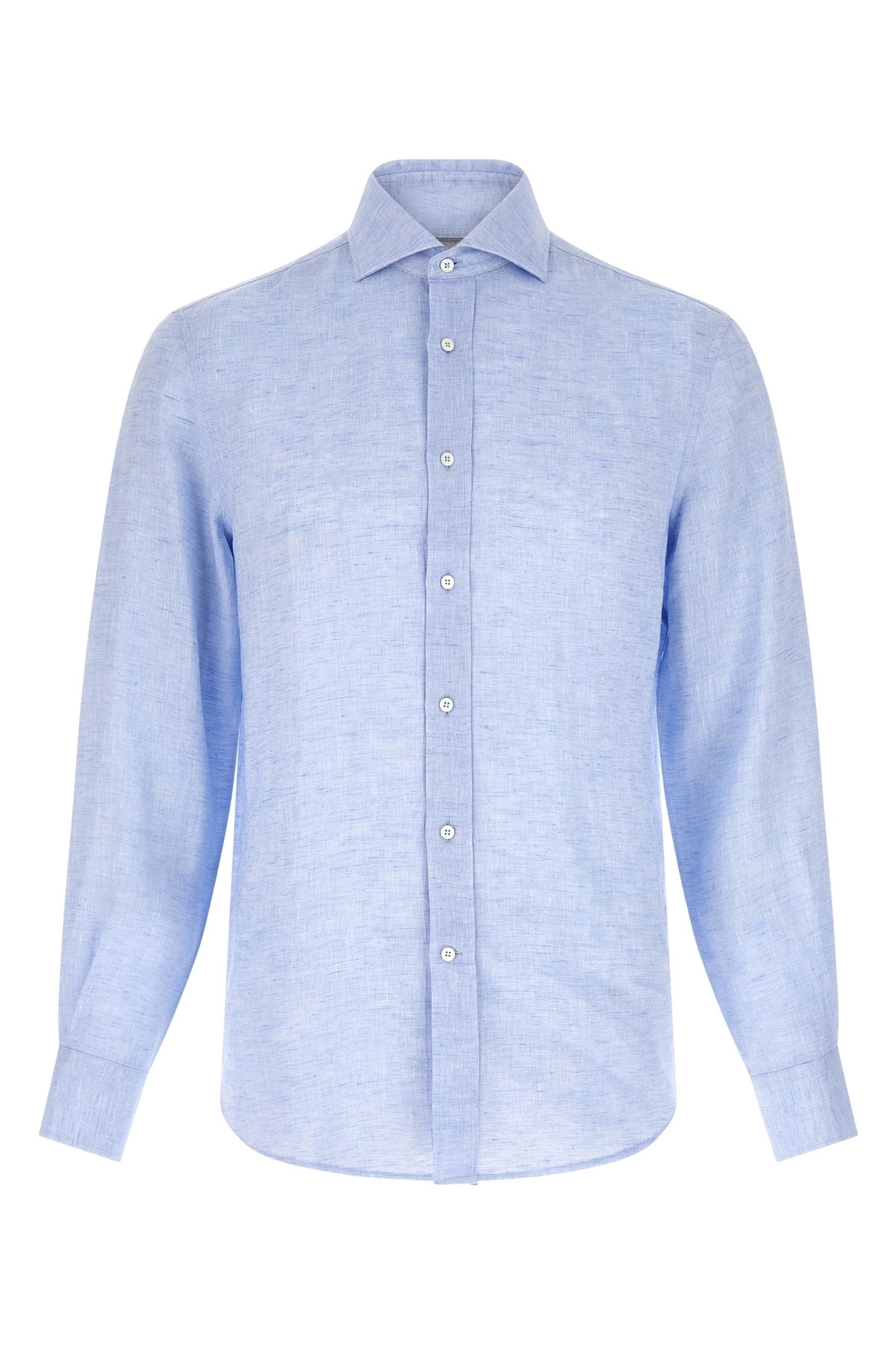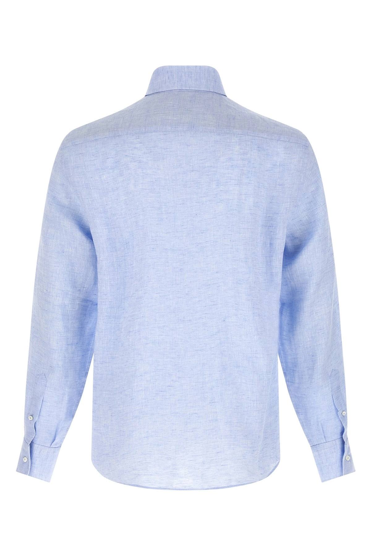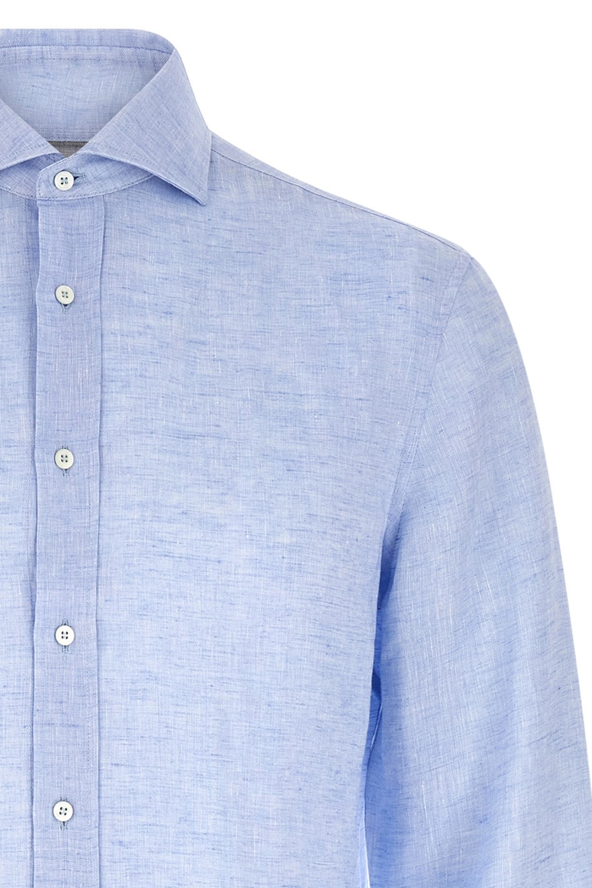 cod. MM6840627YC105 Mélange linen shirt with French collar, front mother-of-pearl button closure, long cuffed sleeves, rounded hem. Color: Light Blue Size & Fit: Easy fit Composition: 100% linen Made in: Italy