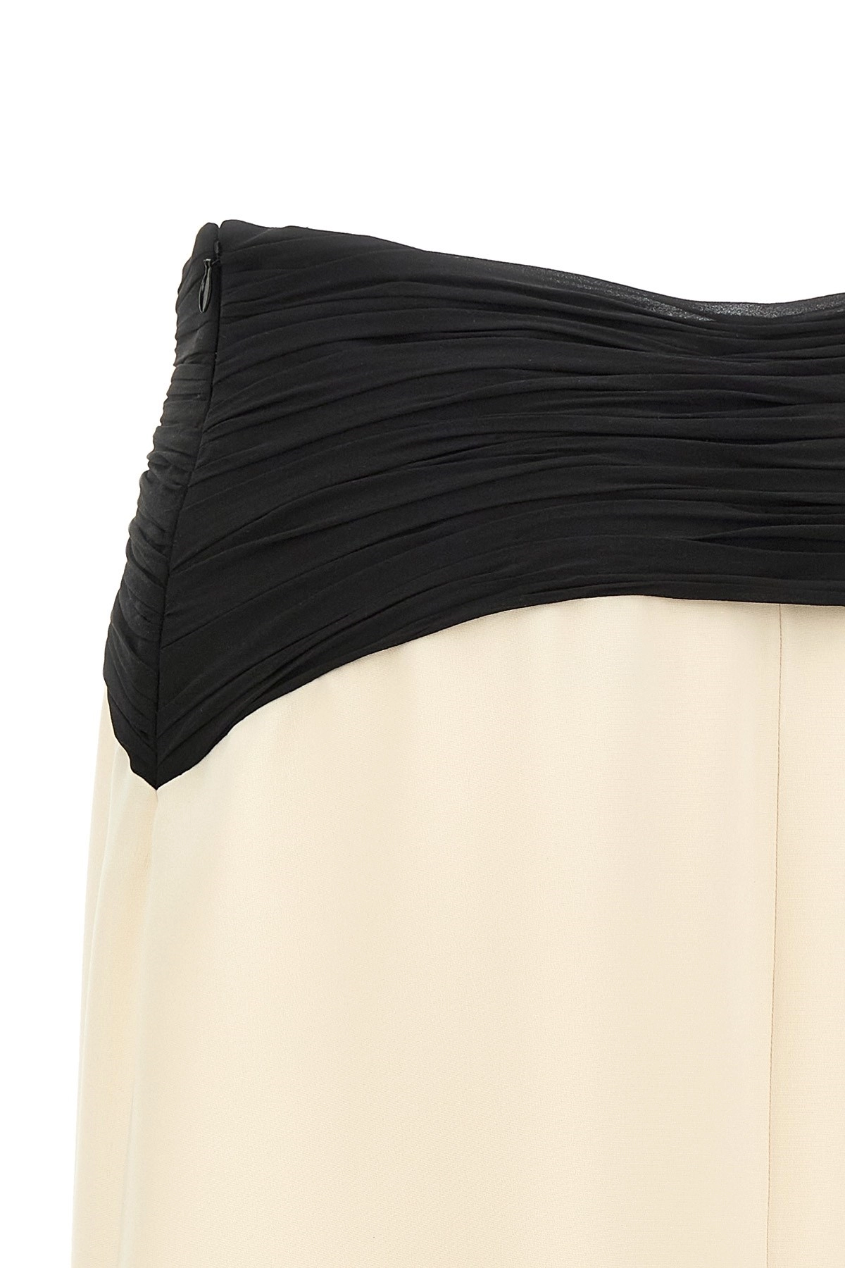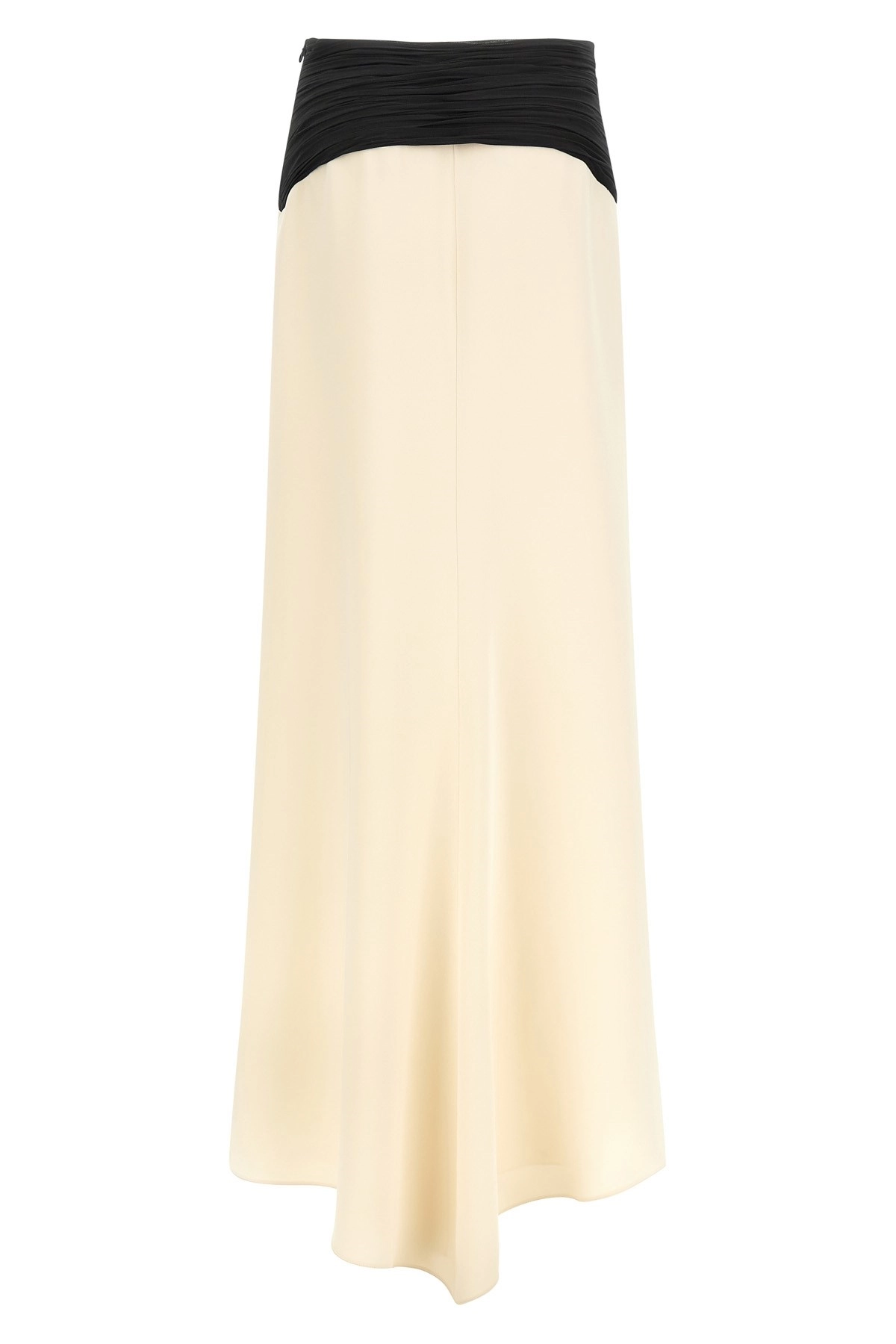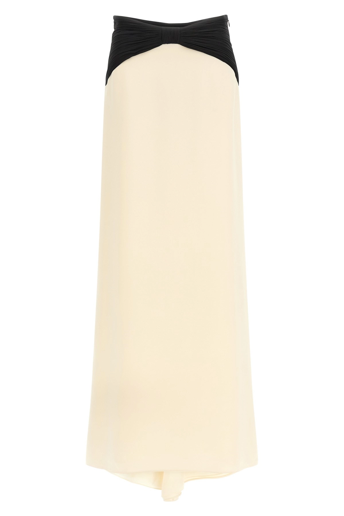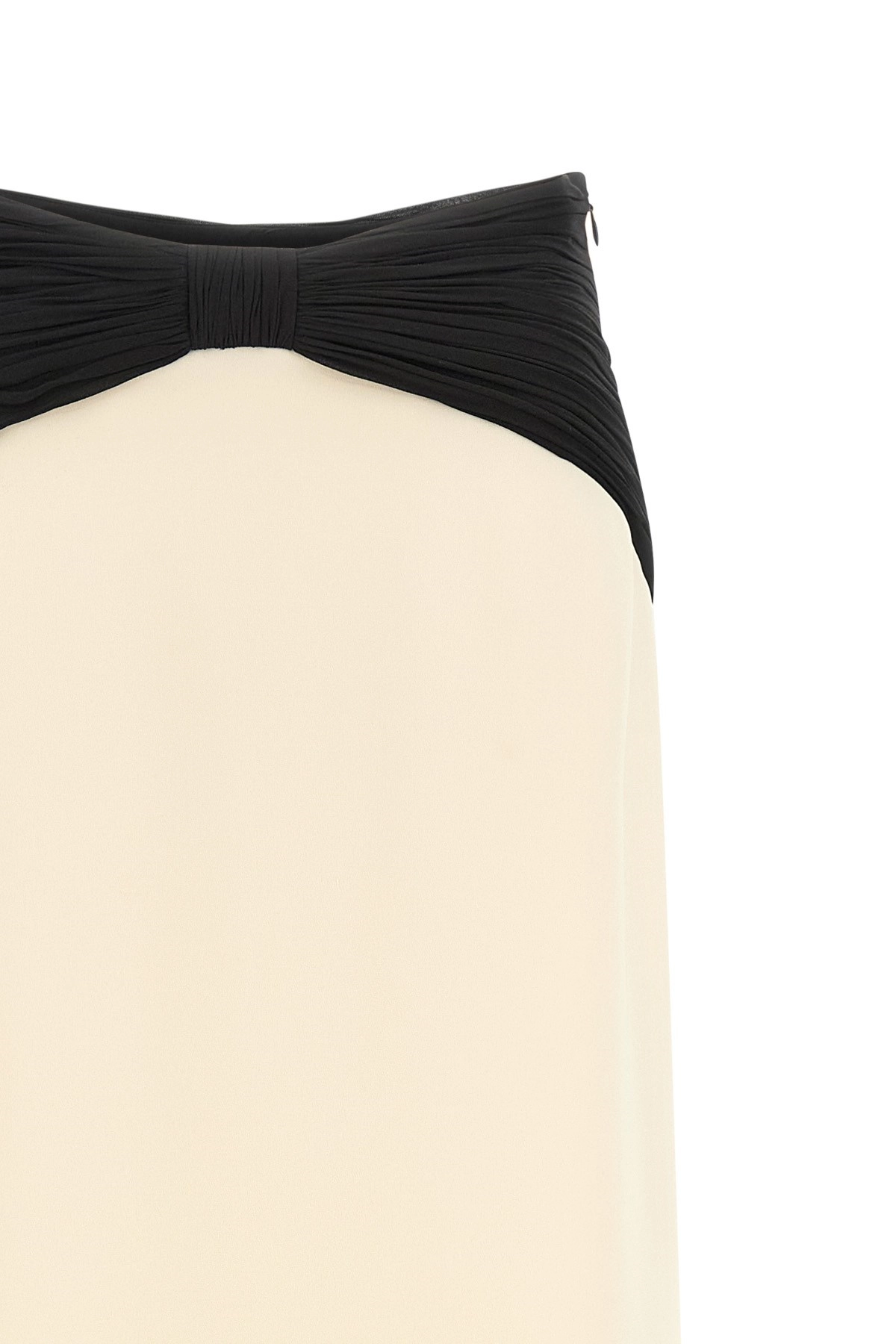 cod. B0RAF151MM9Z7 Long Cady Couture skirt with flared silhouette, contrasting details at the waist with front knot and front and back curls, side zip closure, asymmetrical hem, lining. Color: White/Black Size & Fit: true to size fit Composition: 100% silk Made in: Italy